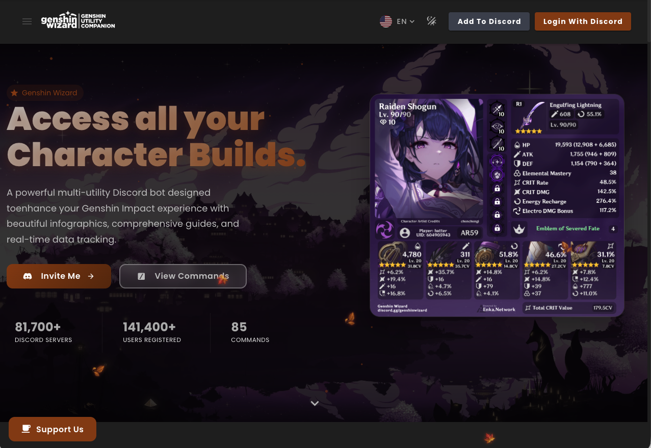 Used by hundreds of thousands of Travelers, this bot integrates data from trusted sources like KQM (KeqingMains) to provide expert guides directly in your server. Whether you want to show off your artifacts or check your pity count, Genshin Wizard handles it all without modifying game files, ensuring a safe experience.