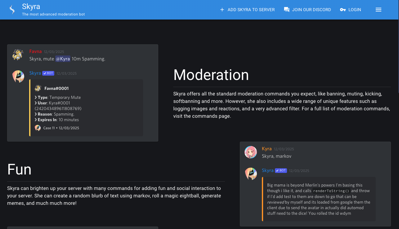 For admins tired of managing 10 different bots, Skyra aims to do it all. From heavy moderation and anti-spam to leveling systems and games, it cleans up your member list by replacing multiple specialized bots.