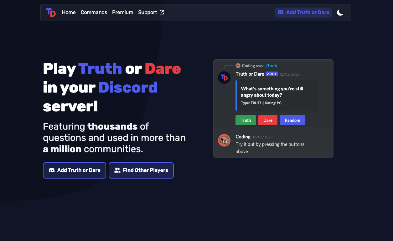 Truth or Dare is a classic party game bot designed to break the awkward silence in voice chats.